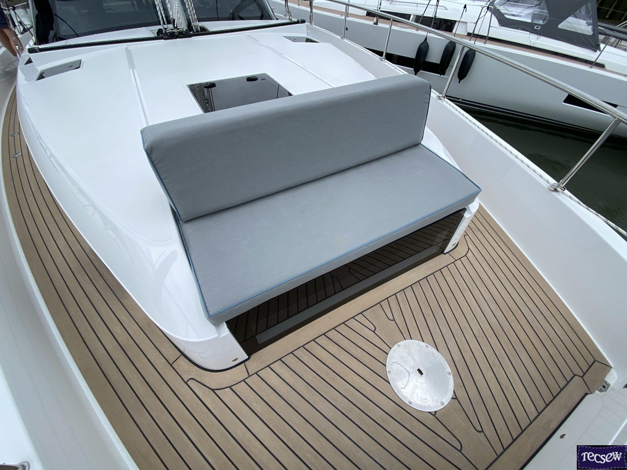 Tecsew’s Bow Seating and Backrest cushions for the Moody 48 DS combine luxury, practicality, and style to elevate your on-board experience.